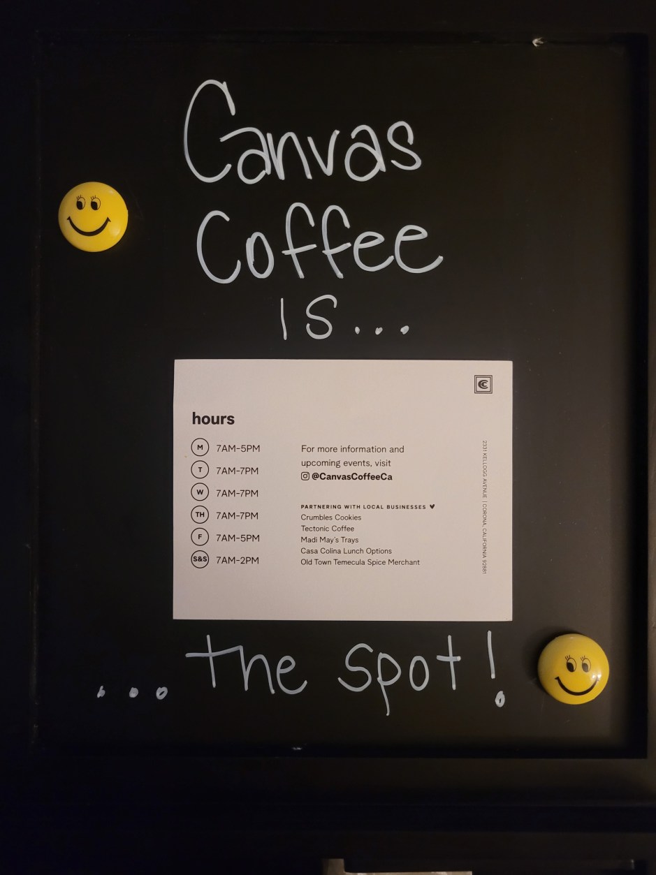 If you’re looking for a place to spend time with friends and family or relax by yourself, Canvas Coffee Shop is the spot. Please follow them on Instagram-@CanvasCoffeeCa. And if you live in the area, check them out.